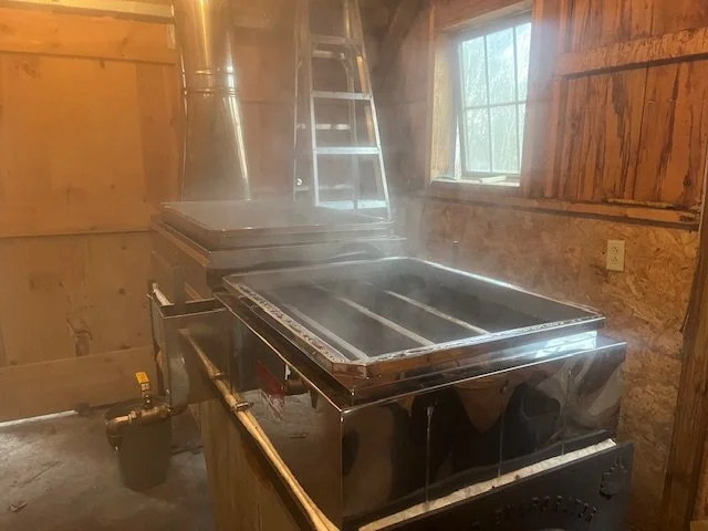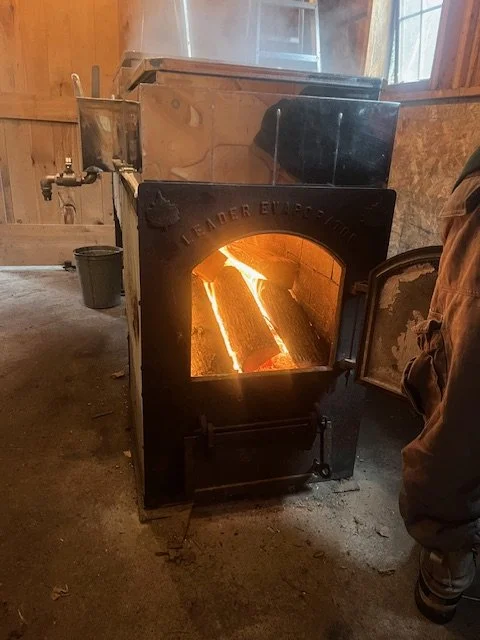 My late husband and I built our sugar house with the help of old friends on the rise behind our home at the edge of a deep old-growth hemlock forest. A small shed houses the Arch and Syrup evaporator, a beautiful, efficient backyard rig made by the Leader Evaporator Company in Vermont’s North East Kingdom. The Arch has an insulated fire box that accommodates 18 inch logs or bigger, and an evaporator that sits on top made up of stainless steel pans, sensitive to heat fluctuations and easily warped, where the sap turns into syrup.
