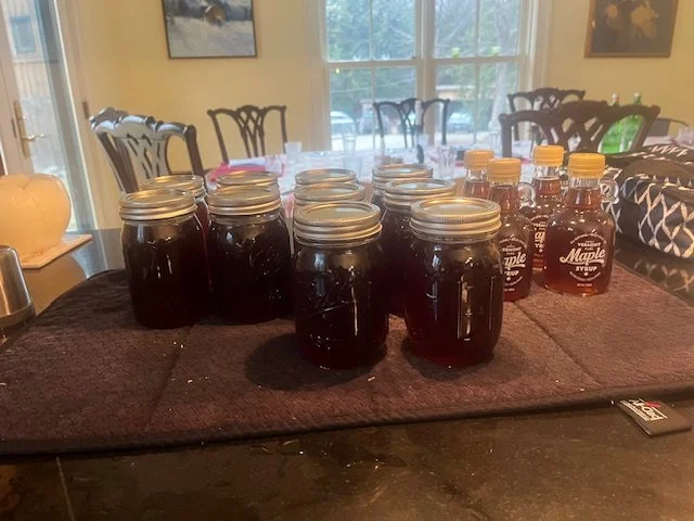 Another bi-product is what happens when we come together. Many of us don’t know each other very well; we only assemble as a group during syrup season, once a year. The process is time-consuming, so we have time to talk between draws, as the sap boils, as the light fades and the sugar house lights come on. We eat together. Sometimes all together around my dining room table, which was my grandfather’s and can accommodate 16 if we need it, which we often do. Other times we eat in shifts as the boil requires a midnight watch. Our food is also the product of the community as everyone brings something to add.