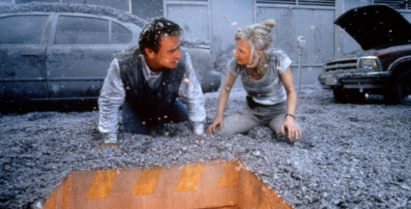 This film has a lot going for it—Pierce Brosnan and Linda Hamilton star as middle-aged, thrown-together protagonists who team up to first convince the town and then escape it altogether. Set in the Washington mountains, Dante’s Peak deals out equal parts treacle and gore. Brosnan’s Harry Dalton—fresh out of an abusive situationship with another volcano that cost him his romantic partner and his fondness for exploding mountaintops—starts the action when he walks into Dante’s Peak during a summer town fair.