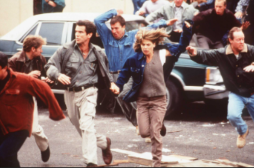 This film has a lot going for it—Pierce Brosnan and Linda Hamilton star as middle-aged, thrown-together protagonists who team up to first convince the town and then escape it altogether. Set in the Washington mountains, Dante’s Peak deals out equal parts treacle and gore. Brosnan’s Harry Dalton—fresh out of an abusive situationship with another volcano that cost him his romantic partner and his fondness for exploding mountaintops—starts the action when he walks into Dante’s Peak during a summer town fair.