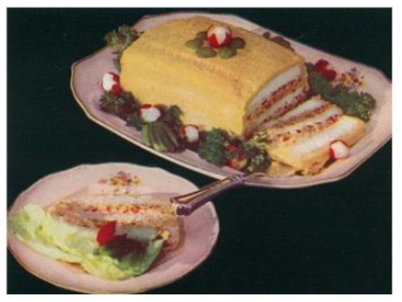 The basic goal was to make fancy looking entrees or sides with inexpensive ingredients. My all-time favorite recipe is the Surprise Loaf, which looks like a cake but is, in fact, made out of Wonder Bread, mayonnaise, coleslaw, and relish. Yum. It was garnished with radish rosettes and appeared in The Silent Hostess: Treasure Book, produced by General Electric in 1932.
